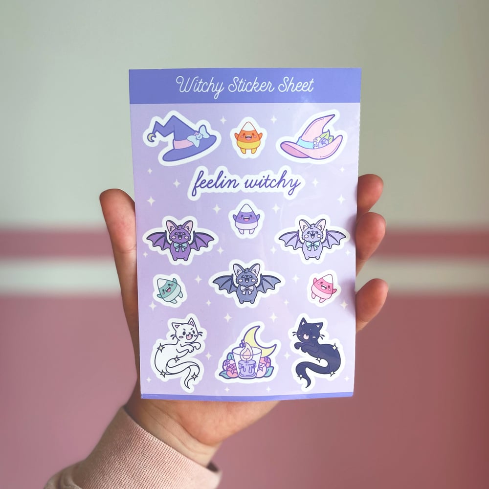 A super cute, spoopy, 4x6 pastel witchy sticker sheet that's perfect for decorating your notebooks, calendars, scrapbooks, water bottles, and more !
